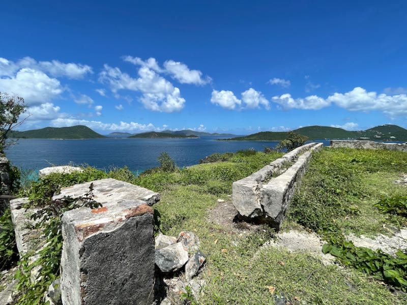 After less than five minutes, you will see a small path on your left that leads you to the former guardhouse site. This structure was purposefully located in a strategic spot, so the overseer was able to keep an eye on the the Fungi Passage, between Whistling Cay and Mary Point, and the Narrows, which separates Great Thatch and St. John.