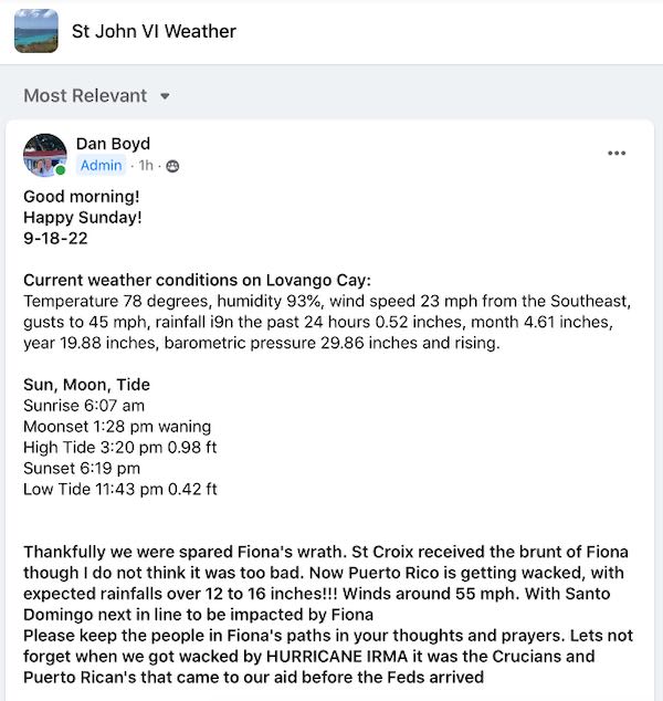 This is a very informative page for those of you who are on Facebook. Dan Boyd and crew post the weather daily. It is super accurate and a page that many of us rely on for local forecasts. You can find it by searching “St. John VI Weather” on Facebook.