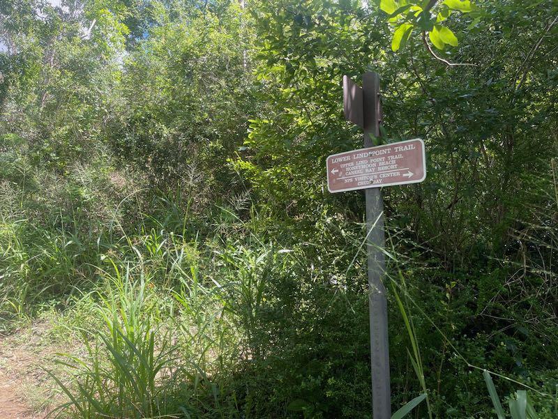 After roughly 15 minutes of walking, you will come the trail that leads down to Salomon beach. As you continue walking, you will see another trail that leads slightly uphill on your right. This connects to the upper Lind Point trail. Skip both of those trails and continue forward if you’d like to visit Honeymoon beach.