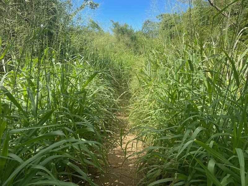 You will come to yet another intersection about five minutes further. This is a larger intersection where the trails are wider. If you follow the trail straight and up to your right, you would eventually come up to North Shore Road, or Route 20 on the map. Take the more narrow trail downhill to get to Honeymoon beach.