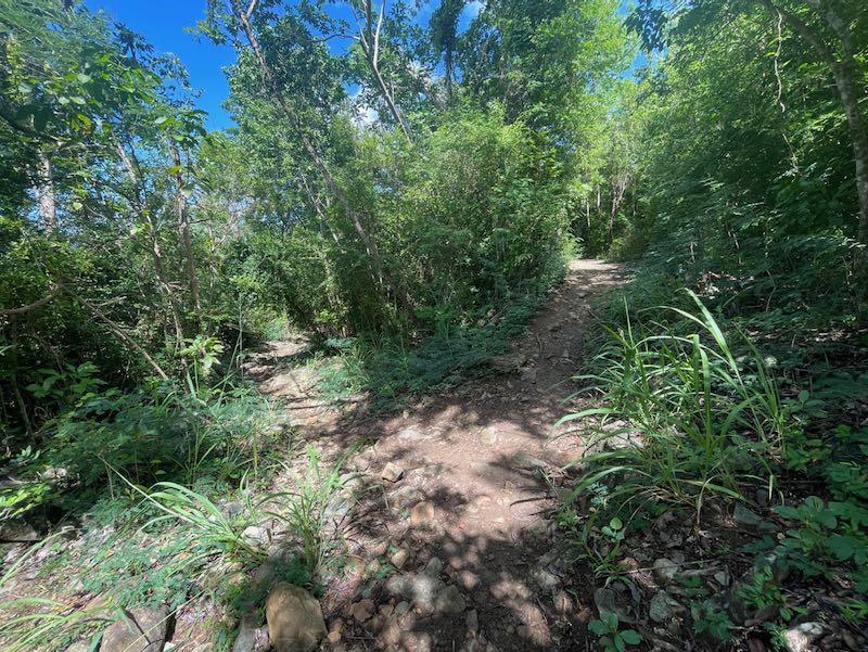 To start the hike to Honeymoon, you will walk up these stairs and then take left at the top. You will see the Caneel Bay apartments to your right and beautiful views of Cruz Bay to your left. You will walk up a small hill, and will quickly see the trail going into the woods on your right.