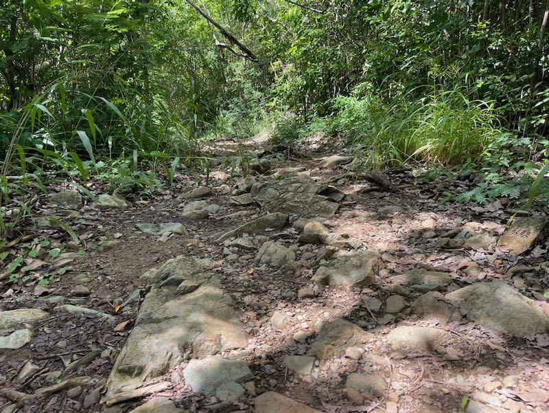 As you can see in the photos below, there are some rocky areas along this trail. There are also some spots that are very sunny, and others that are rather overgrown. This trail is definitely doable in flip flops, but it’s a lot easier in sneakers or sandals with straps like Tevas or something similar to that.