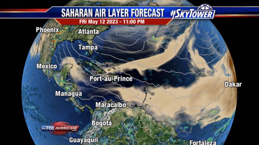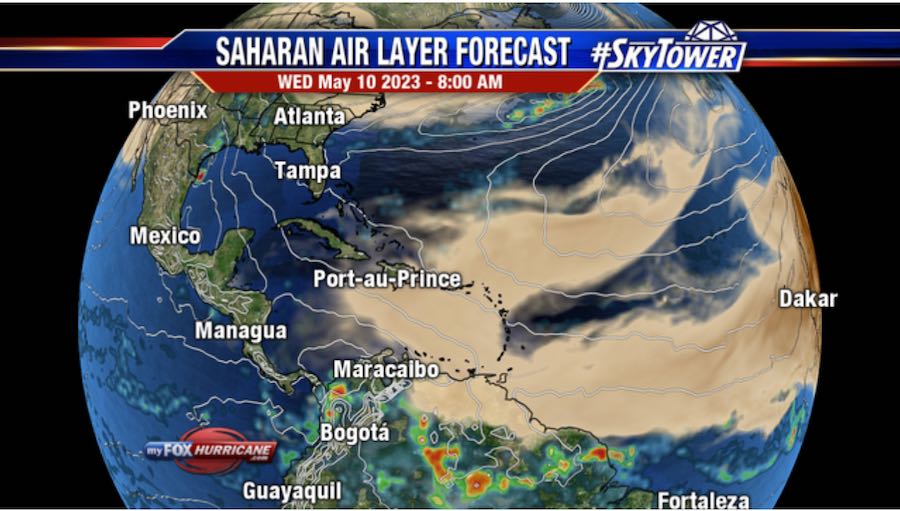 One cool thing about the Saharan Dust is that you can track it on radar, just like you can track a rainstorm. I like to use myfoxhurricane.com to track it. The first image below is the dust as of this morning (May 10th), and the second image is Friday night’s forecast.