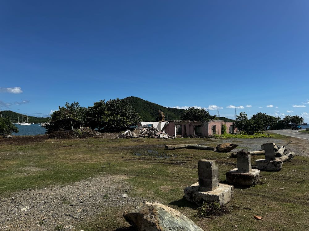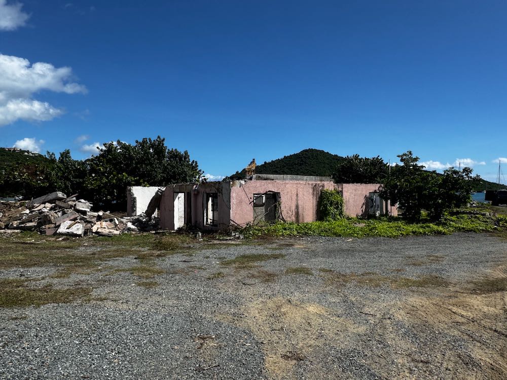 The building (the opposite side of Island Blues) was the home of Tall Ships Trading, a screen printing business owned by Elliot, a well-known Coral Bay resident, when Hurricane Irma destroyed it back in 2017. The building has remained in shambles and relatively untouched since.