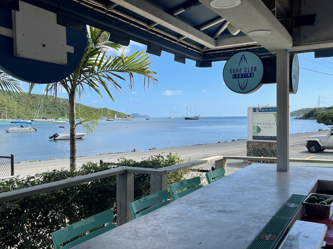 Surf Club Cantina is located across from Coral bay harbor. It’s a cute little open air spot that always has incredible breezes and views. It is located in the Isola Shoppes complex, which also includes Sharky’s, Jolly Dog, Zemi and 340 Real Estate.