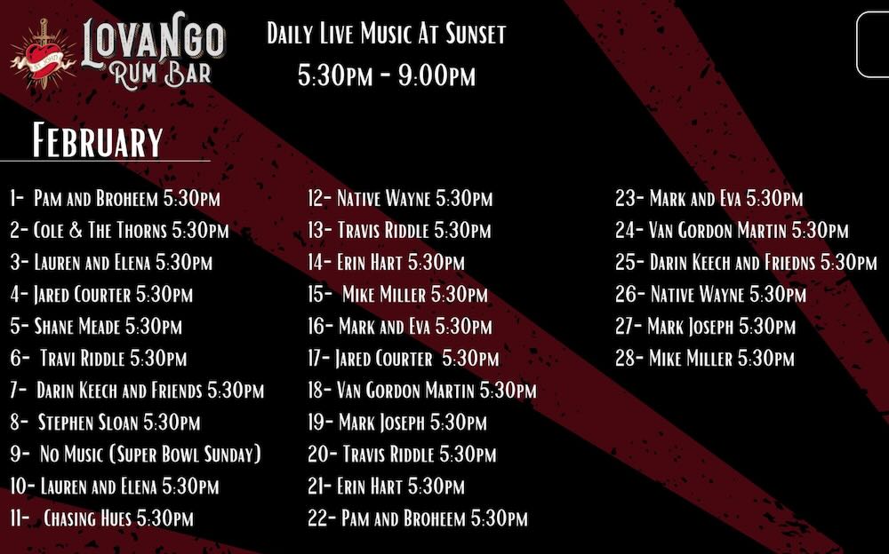 Lovango Rum Bar has live music daily as well. Their music begins at 5:30 p.m. on the patio. Here is the schedule for the month of February: