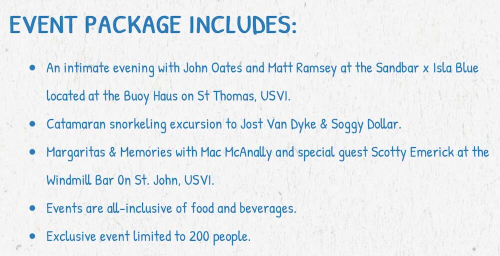 Hit Makers and Rum Chasers is returning to St. John from Thursday, March 20th through Saturday, March 22nd. This is a pretty incredible culinary and music event. It is pricey, but there are some pretty big names attached to it like Matt Ramsey of Old Dominion and Mac McAnally. This three-day event costs $2,499 per person. That includes the following: