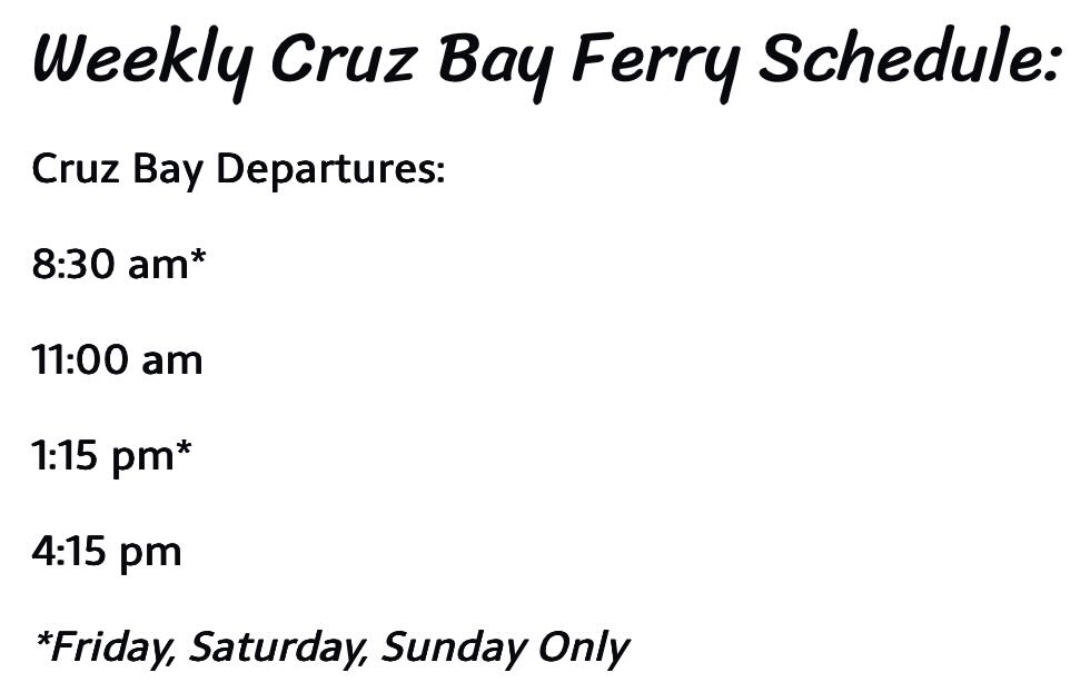 The Charlotte Amalie ferry will resume operations today. There are now three ferry options for people traveling between Cruz Bay and St. Thomas. (This is in addition to a car barge that transports people with vehicles.)