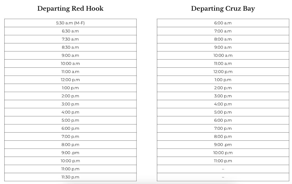 The ferry between Cruz Bay and Red Hook leaves hourly throughout the day. Here is that schedule in its entirety: