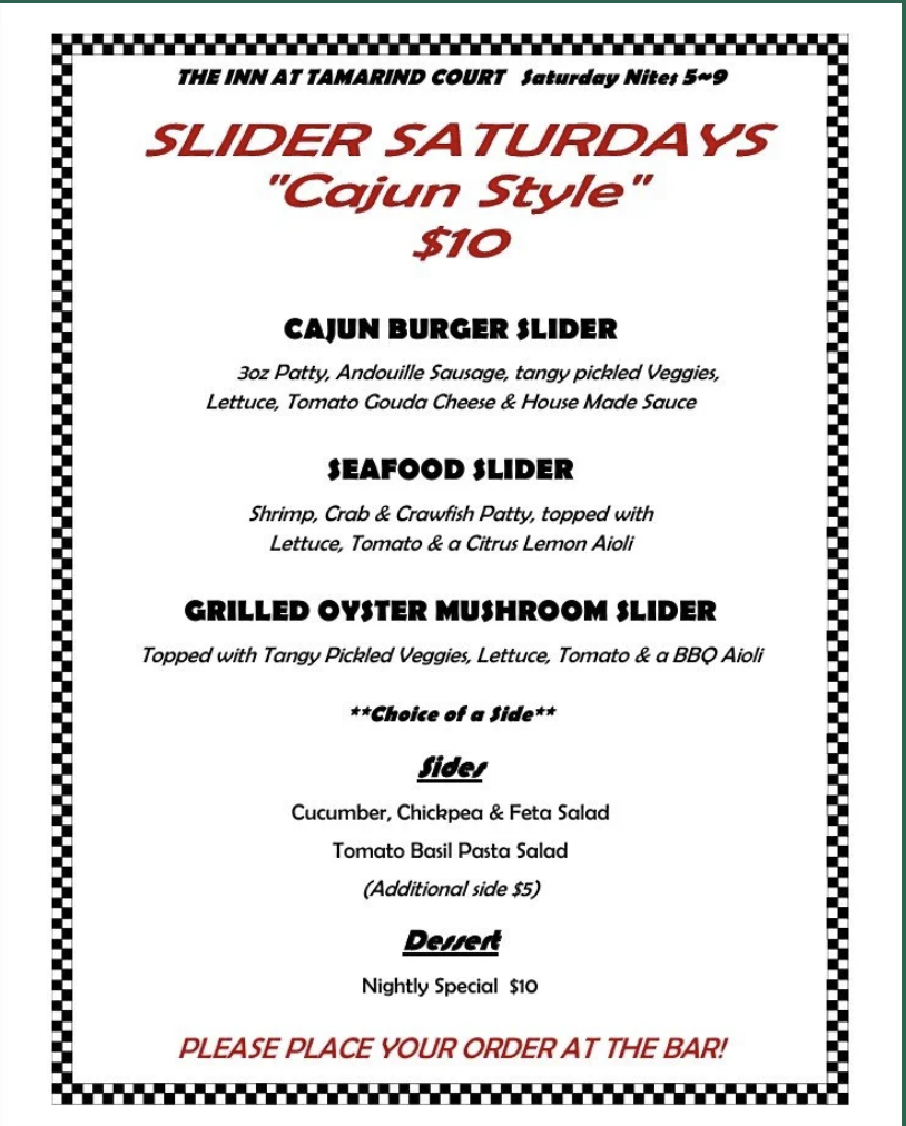 The Inn at Tamarind Court serves dinner Monday through Saturday from 5 p.m. to 9 p.m. They are also open for breakfast seven days a week.