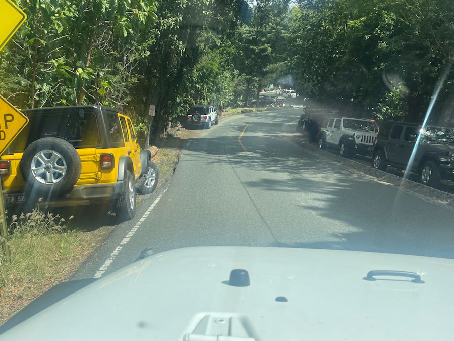 You are allowed to park across the street near the plantation building as long as your tires and mirrors are off the road. You will see there are no parking and no parking beyond this point signs in that area. I have seen numerous vehicles ticketed here for ignoring those signs, so keep an eye out and look for arrows.