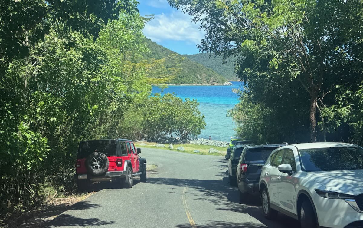 There are two large parking lots, so this is an easier place to find a spot. You can also park along the roadway a bit, but again, all tires and mirrors off the road, and please do not park in a way that you can damage a tree. There are a handful of spots where you can park along the road inside of Cinnamon Bay (near the parking areas) too.