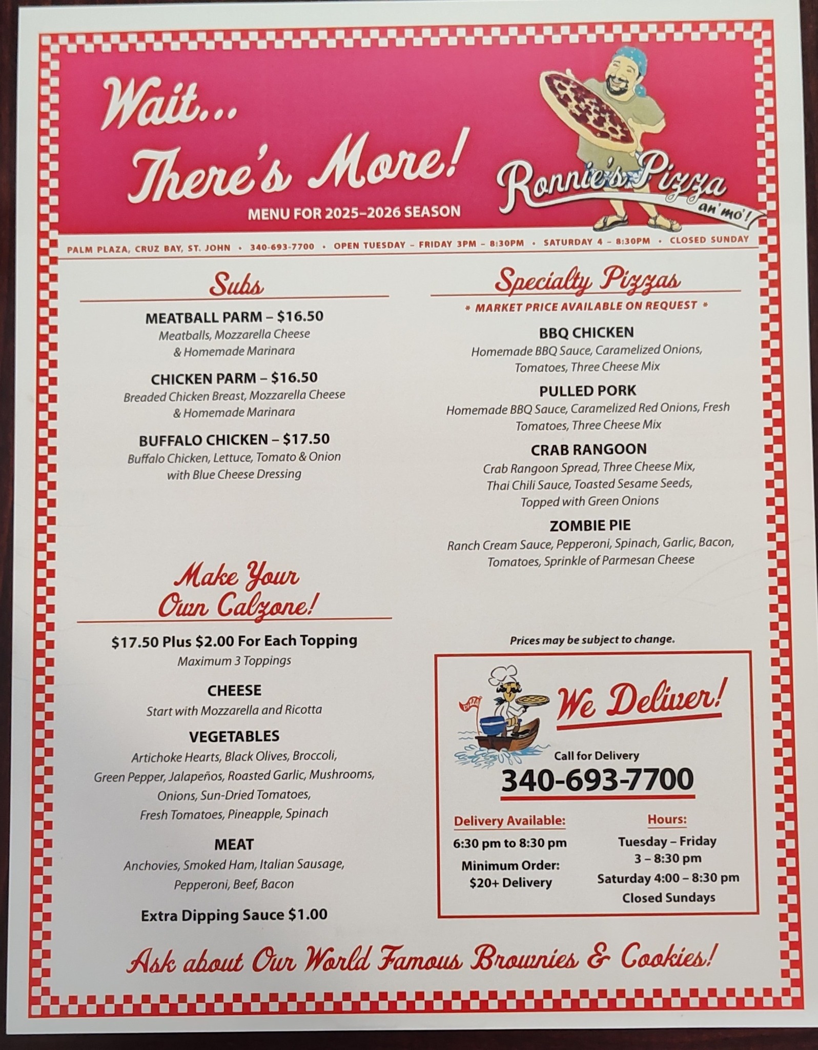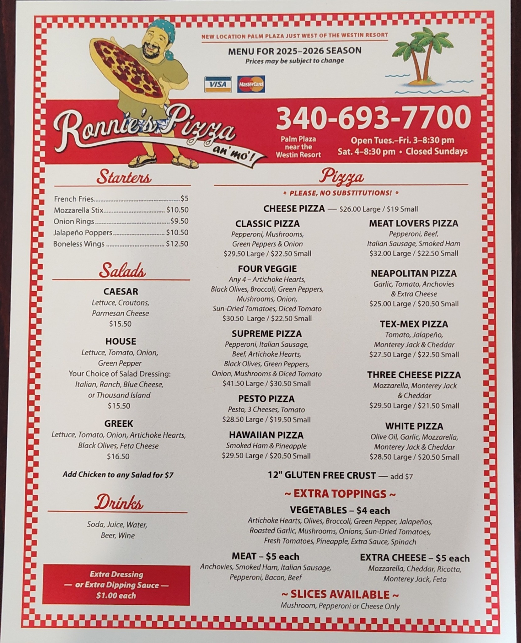 Ronnie’s Pizza is located in Palm Plaza in Cruz Bay, which is next to the Westin Resort and across the street from Dolphin Market. (This is not the Dolphin Market that is at the roundabout. This Dolphin Market was formerly called St. John Market. Confusing, I know.)