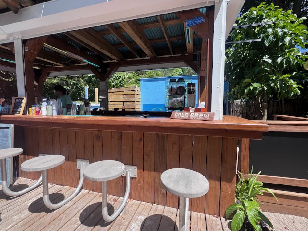 Little Fish has numerous shaded picnic tables and several bar stools too. It has great breezes and, of course, beautiful views of Maho Bay.