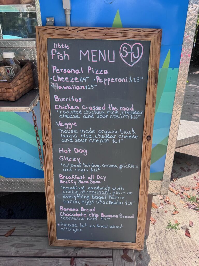 Little Fish is aptly named because they’re the little fish in the sea out there at Maho Bay, they told me last week. This new bar and food truck is located directly across from Maho Bay beach and right beside Maho Crossroads. It has a full bar with high-quality liquors, nice wines and frozen drinks in addition to all of the typical island favorites. Little Fish serves breakfast and lunch too. Did I mention how excited I am about this??!! Check out a few pics: