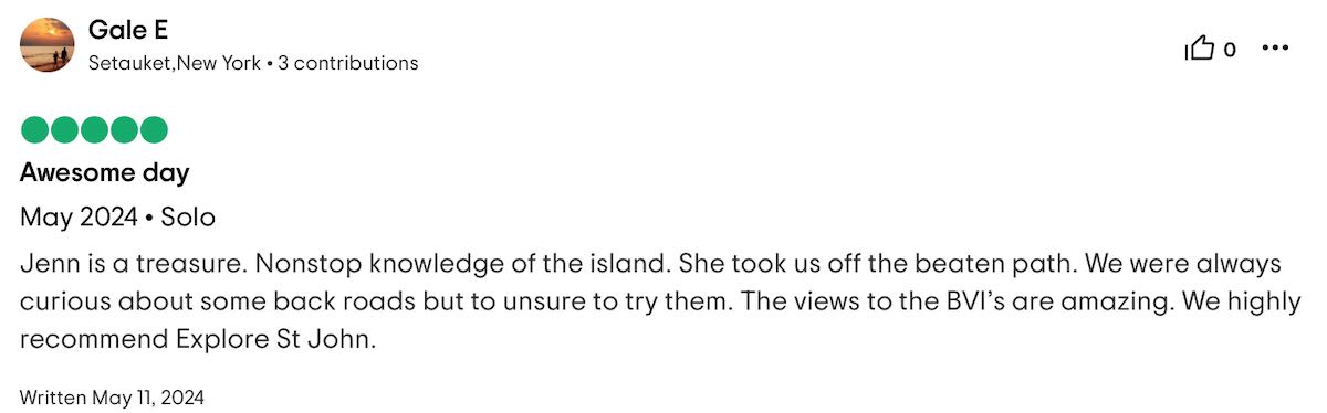 You can also cool off by taking an island tour with me! (Shameless plug lol) Take a scenic ride around the island. Learn about St. John’s rich history and get some good island gossip along the way. We can even stop at a tiki bar or two along the way if you’d like. Learn more at www.explorestj.com/tour or email me at jenn@explorestj.com. It’s never too early to reserve your day. Click here to read my reviews on TripAdvisor.