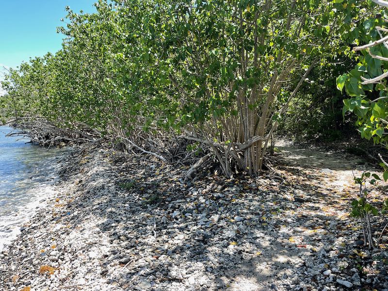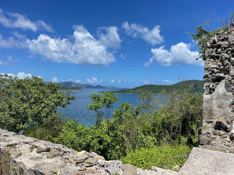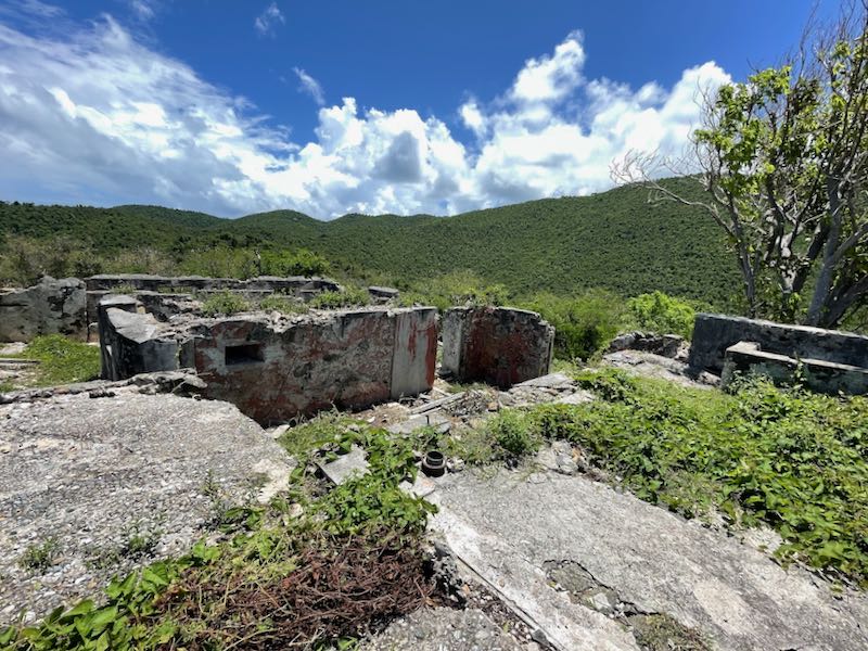 After less than five minutes, you will see a small path on your left that leads you to the former guardhouse site. This structure was purposefully located in a strategic spot, so the overseer was able to keep an eye on the the Fungi Passage, between Whistling Cay and Mary Point, and the Narrows, which separates Great Thatch and St. John.
