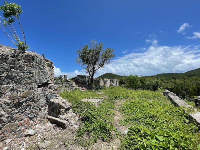 From the guardhouse, continue your walk uphill. After a roughly five minute climb, you will come to an intersection. Take a left to visit Murphy Great House. (The trail continuing straight leads to the Brown Bay trail and ultimately out to Coral Bay.
